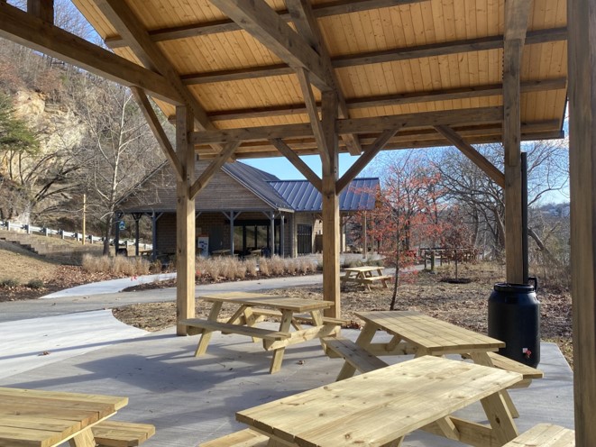 The scope of the project includes 1,732 SF of new construction and 628 SF of renovations to the existing Upper James River Center to provide expanded programming capabilities for the James River Association. New construction includes covered heavy timber pavilions and site upgrades. Renovations include new classrooms and offices, new finishes, folding glass door systems, and adjustments to existing MEP systems.