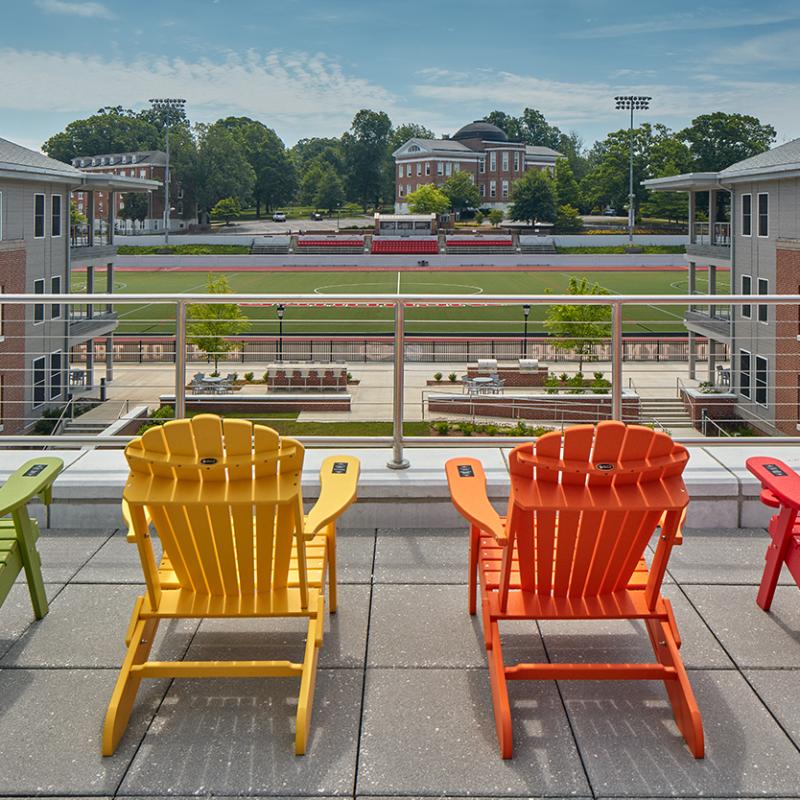 The renovation of Main Hall, a significant historic building, involved a three-story entry vestibule with floor-to-ceiling windows, which contain a spiral staircase from the first to the second floor. The first floor features The Street, which runs through the Student Center and has a dramatic open gathering space on one side and an improved Skeller on the other. An outside deck provides spaces for meeting and eating outdoors.